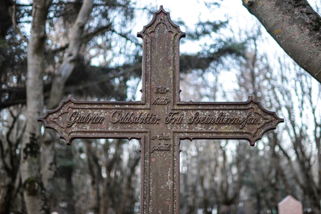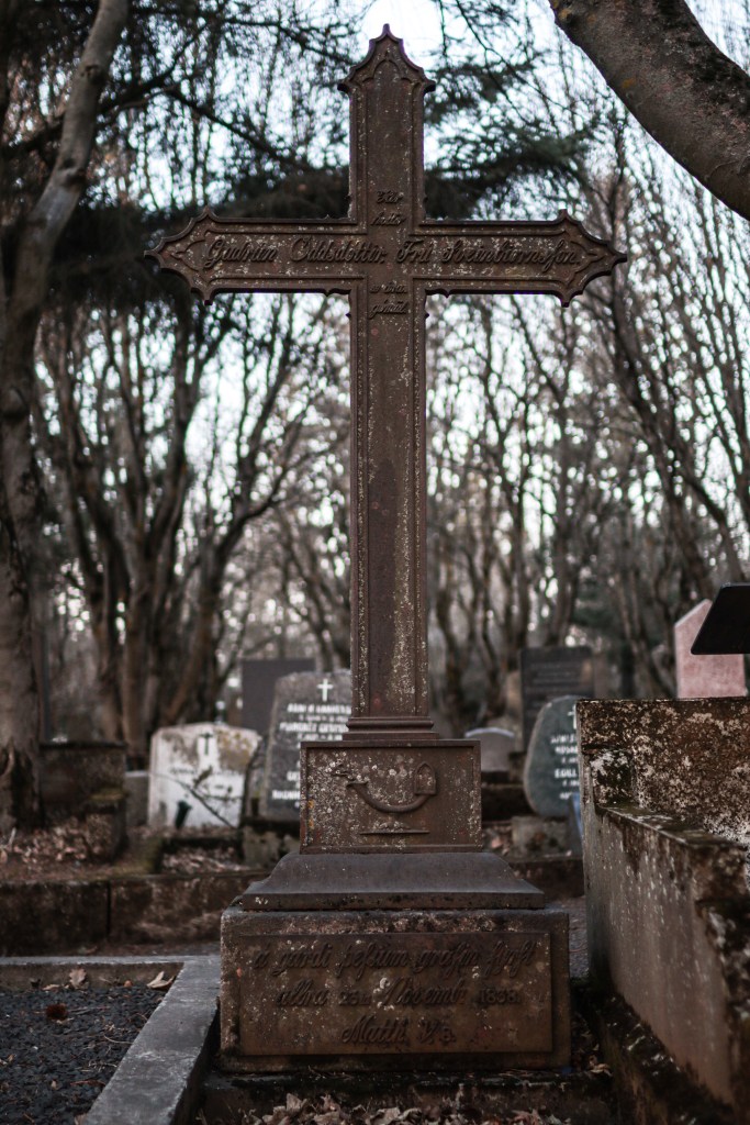 Guðrún’s imposing cast iron memorial cross (you can find it at the T-405 section of the cemetery) is the largest of its kind in Iceland. It’s engraved with a flaming lamp (the cemetery Guardian is also known as a ‘Light Bringer’ so it’s a most suitable motif) with the word Her huili husfru – Here rests the mistress of the house. The engravings remain remarkably easy to read.