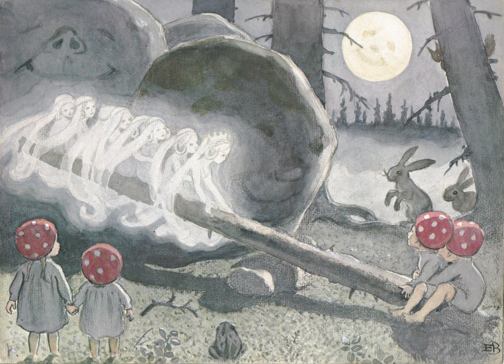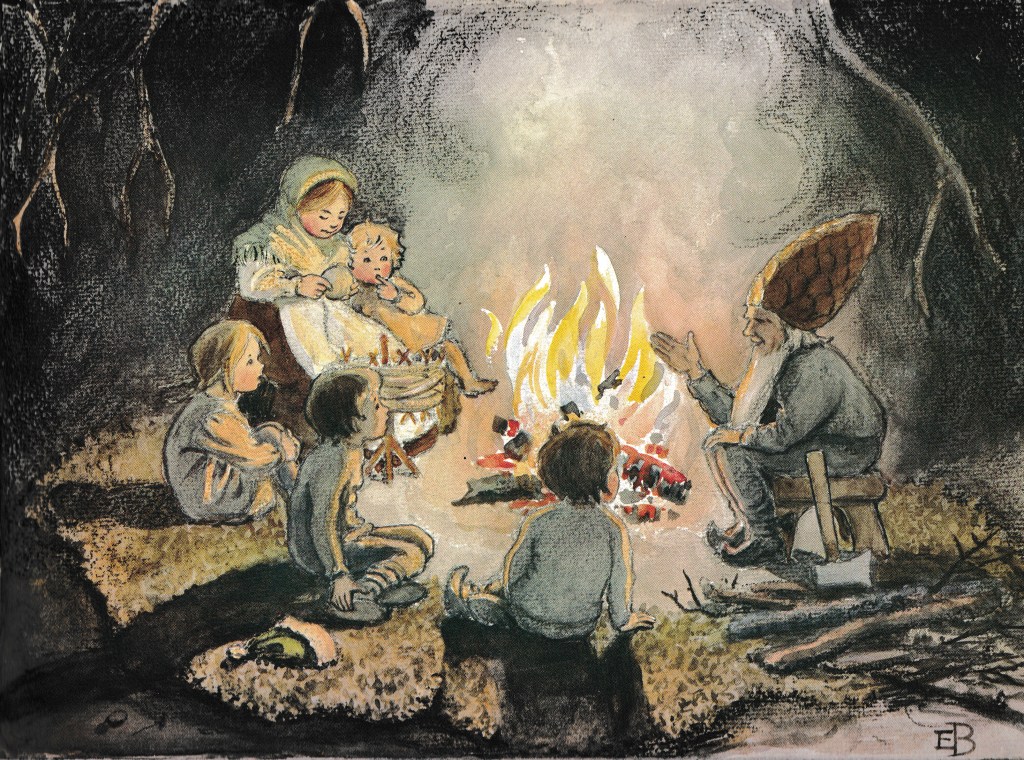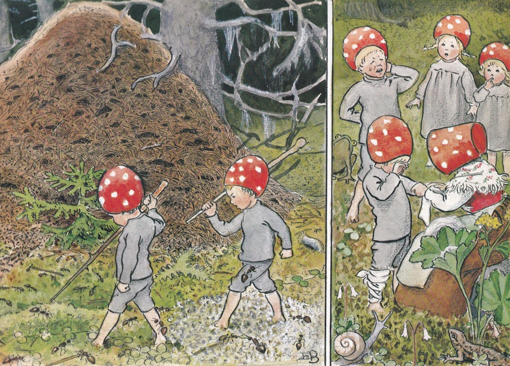 Children of the Forest was one of several Elsa Beskow books my (lucky) brothers received. To finally have Beskow stories in our home was, for me, astonishing. These sumptuous picture books weren’t something we’d been able to afford. I’d need to leaf through them at school (Beskow herself had a liberal upbringing in a progressive family and is one of the keystone authors in early-years Waldorf schooling) or at a friend’s house whose bookcase was rainbowed with the instantly recognisable colourful cloth spines and gold foil lettering.